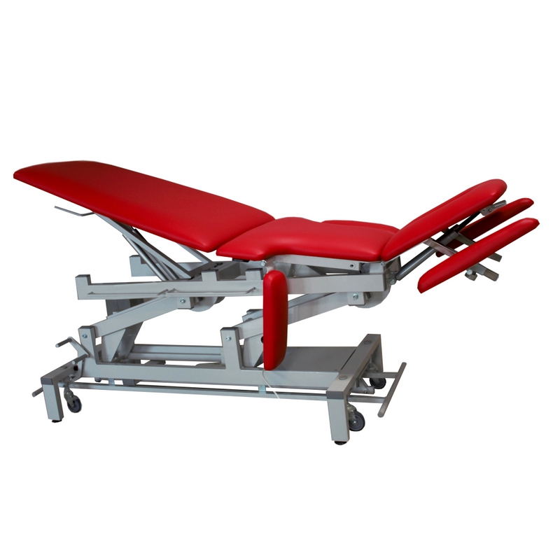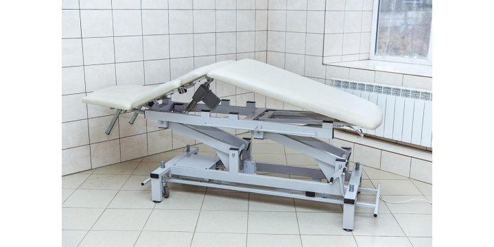 Данный стол обеспечивает расширенные возможности для терапии благодаря трем регулируемым секциям, средние из которых поднимаются "домиком". Также есть возможность опускать и поднимать ножную и головную секции. Кроме трех основных секций, данная модель имеет 4 подлокотника у головной и грудной секций.