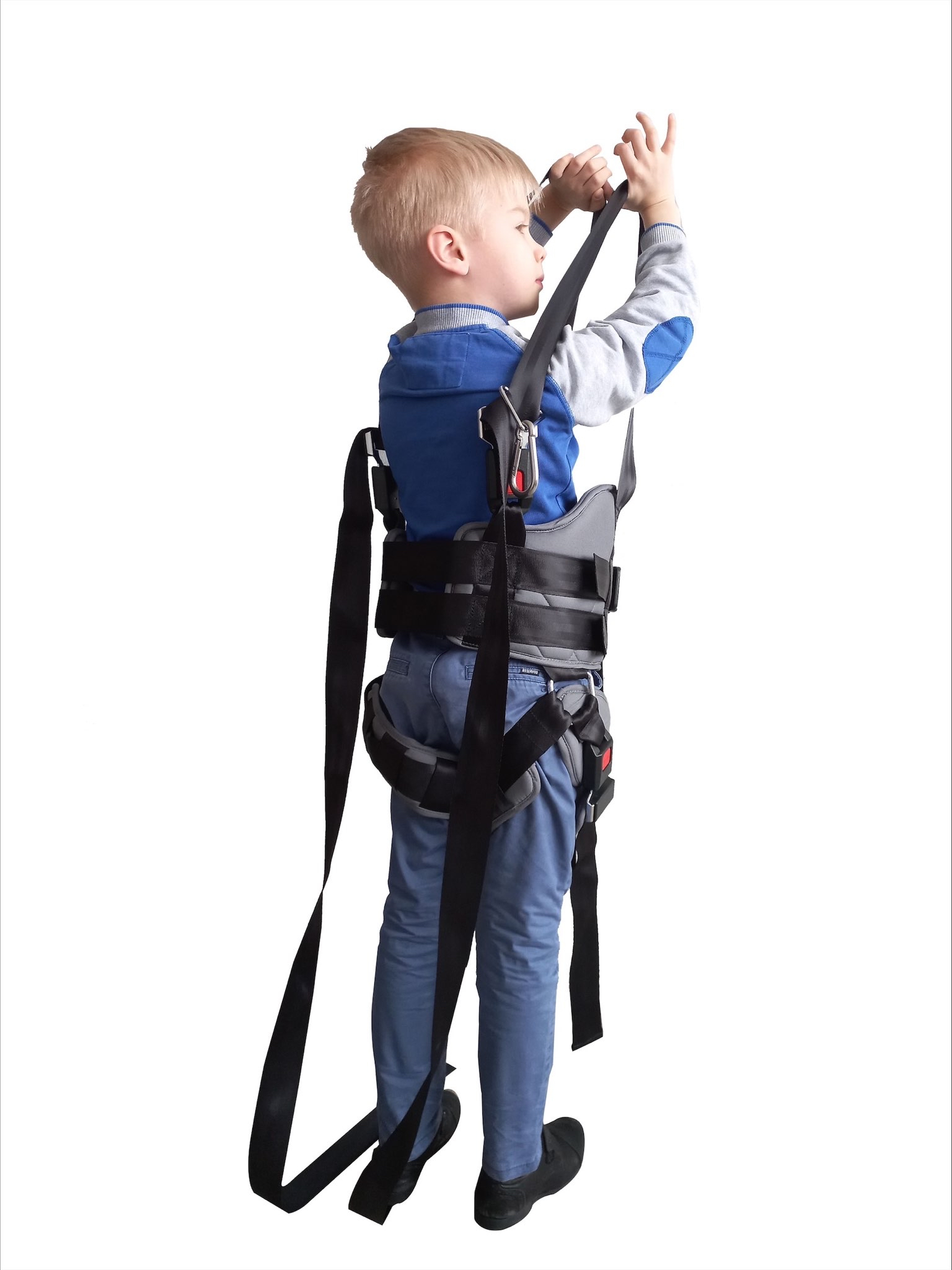 Длина ремней регулируется от верхнего карабина до плеча в диапазоне от 0 до 130 см, что позволяет использовать жилет для людей разного роста и для крепления к потолку, стене и другим поверхностям. Чтобы равномерно распределить нагрузку, на жилете также предусмотрены ремни для обхвата бедер, которые также регулируются и имеют быстросъемные замки. Эти ремни имеют вшитые подушки против натирания ног.